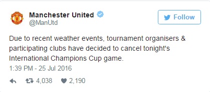 "Dikarenakan kondisi cuaca, Penyelenggara Turnamen dan Klub Peserta pertandingan memutuskan untuk membatalkan pertandingan International Champions Cup nanti malam"