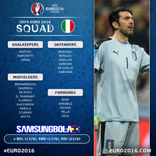 Italia akan menjalani laga pertama mereka di Euro 2016 melawan Belgia pada 13 Juni dengan dipimpin oleh kapten mereka Gianluigi Buffon, yang kemungkinan besar akan ditemani oleh trio bek Juventus Andrea Barzagli, Leonardo Bonucci dan Giorgio Chiellini di lini pertahanan.
