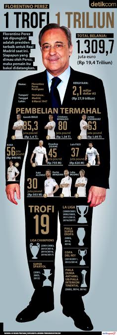 Dengan dana sebanyak itu, Perez sudah menghadirkan 19 trofi selama jadi presiden Madrid yang mana satu trofi itu berharga sangat mahal yakni Rp 1 triliun. Berikut ini adalah catatan kiprah Perez dalam angka.