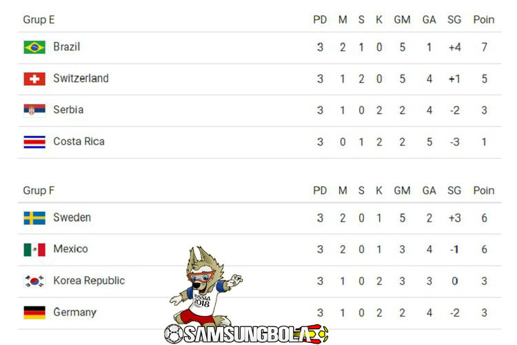 Seluruh pertandingan Grup E dan Grup F telah rampung pada Rabu (27/6/2018) malam atau Kamis dini hari WIB.