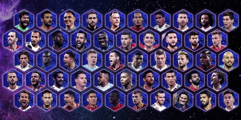 Penyerang: Gareth Bale (Real Madrid), Edinson Cavani (Paris Saint-Germain), Paulo Dybala (Juventus), Edin Dzeko (AS Roma), Roberto Firmino (Liverpool), Antoine Griezmann (Atletico Madrid), Harry Kane (Tottenham Hotspur), Robert Lewandowski (Bayern Munich), Sadio Mane (Liverpool), Kylian Mbappe (Paris Saint-Germain), Lionel Messi (FC Barcelona), Neymar (Paris Saint-Germain), Cristiano Ronaldo (Real Madrid/Juventus), Luis Suarez (FC Barcelona), Mohamed Salah (Liverpool).