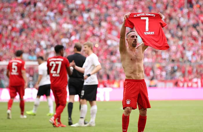 Samsungbola - Sebuah torehan fantastis ditorehkan Franck Ribery seiring keberhasilan Bayern Muenchen merebut gelar juara Bundesliga 2018/2019. Kini, Ribery memiliki sembilan medali juara Bundesliga untuk menjadi pemain tersukses di kompetisi tersebut atau telah mengumpulkan 23 trofi juara bersama the Bavarians, menyamai rekor Oliver Khan.