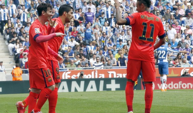 Barcelona meraih kemenangan 2-0 atas Espanyol dalam laga lanjutan La Liga, di Cornella El Prat, Sabtu (25/4/2015). Dengan hasil itu, Barcelona kini menguasai klasemen dengan nilai 81, unggul lima angka dari pesaing terdekatnya, Real Madrid.